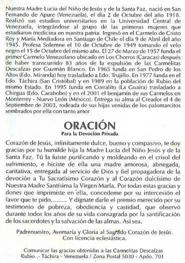 Rogaremos a la Bienaventurada Siempre Virgen María en su advocación del Monte Carmelo, mediadora de todos los Méritos obtenidos por Su Hijo, Nuestro Señor Jesucristo, para que escuche sus peticiones por medio de la Madre Lucía y así alcance ella ser incluida en el Número de los Santos y Santas de nuestra Santa Madre Iglesia Católica, Romana y Apostólica. Amén